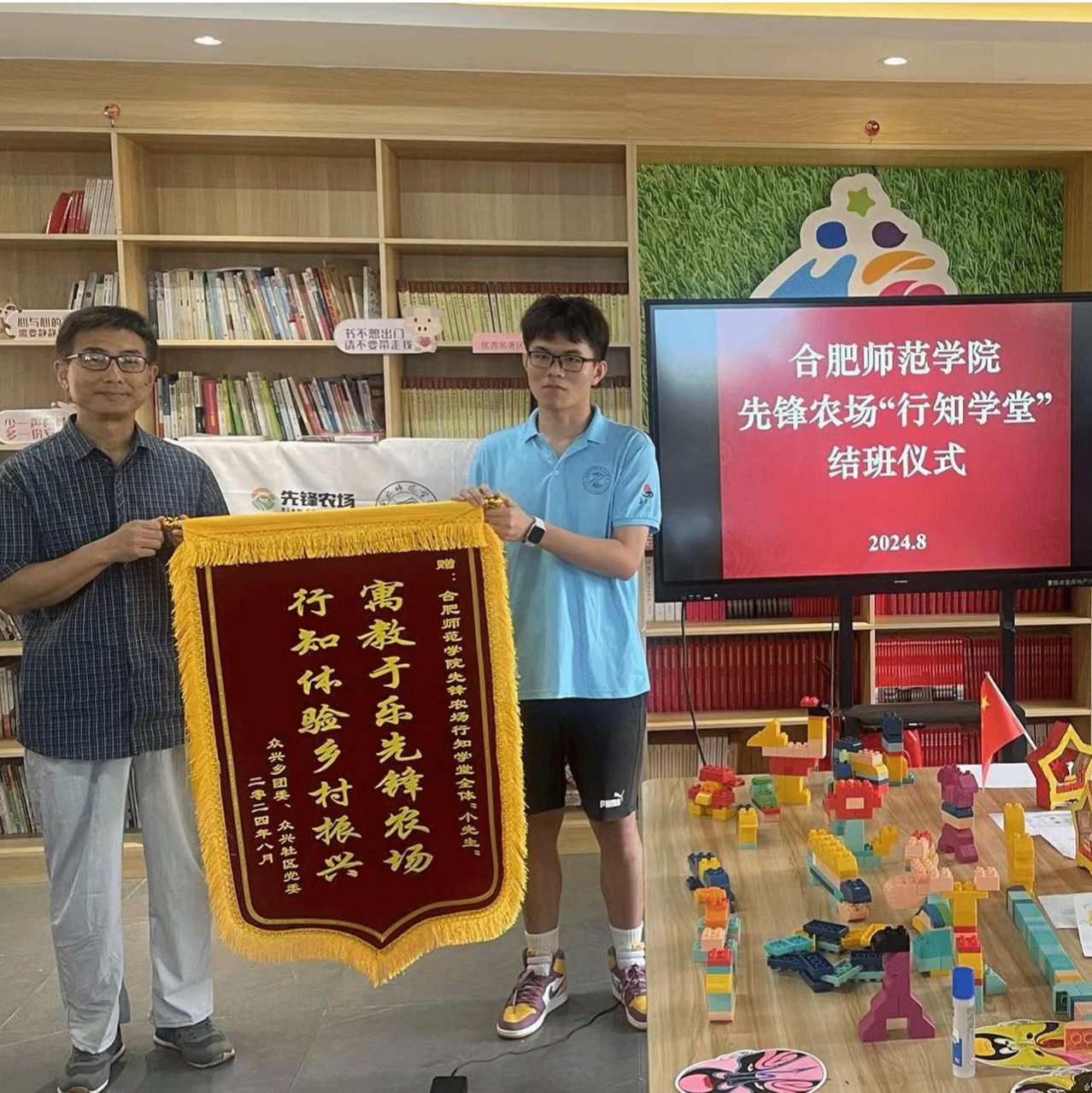 8月9日下午,太阳成集团122ccvip先锋农场行知学堂结班仪式在肥东县众兴乡先锋农场乡村会客厅如期举行。众兴社区乡村振兴指导员沙宝军、党委书记任晓敏,太阳成集团122ccvip先锋农场行知学堂全体“小先生”“小学员”及部分家长参加了结班仪式。结班仪式上,“小学员”们将课程成果进行了展示,手绘脸谱、剪纸、书法、绘制团扇等各种各样的作品铺满了整个作品展示台。“小学员”们还进行了精彩的汇报演出,孩子们带来诗歌诵读、歌舞演绎等个人才艺。...