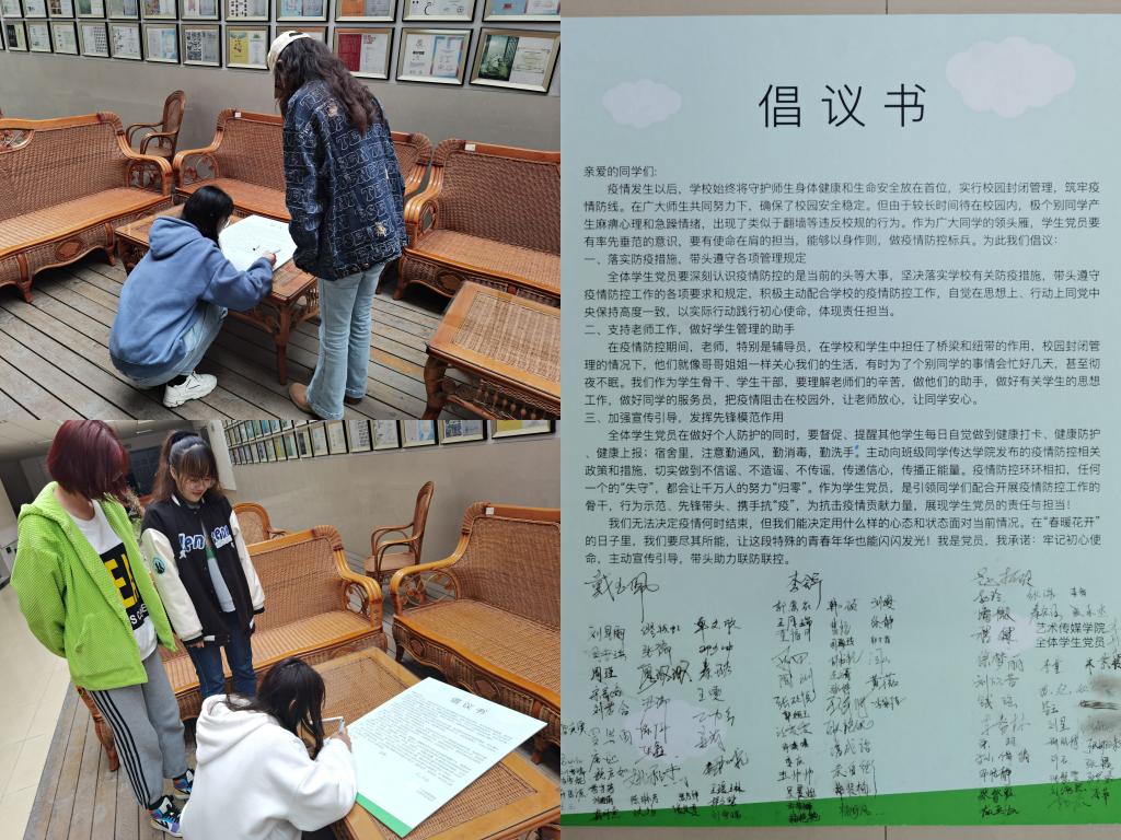 作为广大同学的领头雁,员工党员在关键时期发挥率先垂范作用,担当作为,做疫情防控标兵。4月2日他们发出《倡议书》,全体员工党员在《倡议书》上签字,表示要以身作则,带头遵守公司疫情防控的各项管理规定,做疫情防控的模范。