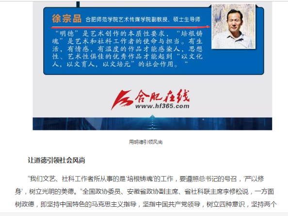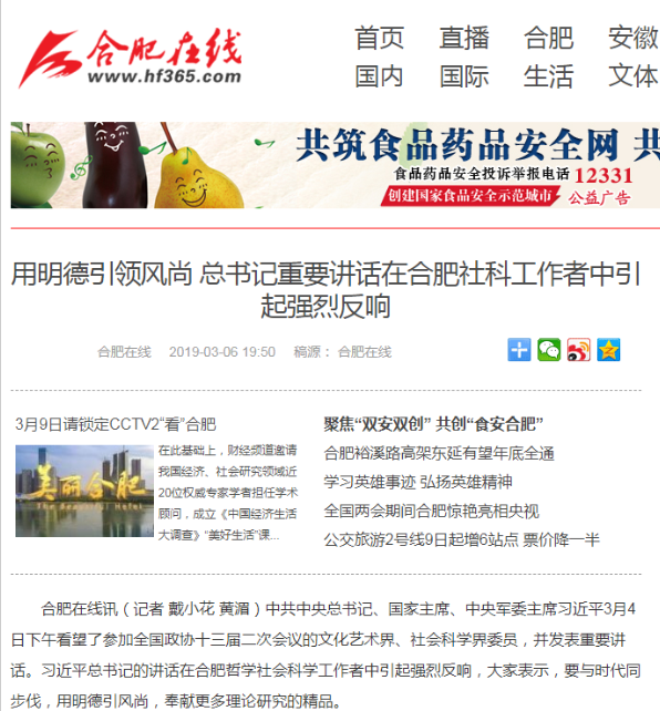 3月4日下午,中共中央总书记、国家主席、中央军委主席习近平看望了参加全国政协十三届二次会议的文化艺术界、社会科学界委员,并发表重要讲话。习近平总书记的讲话在合肥哲学社会科学工作者中引起强烈反响,大家表示,要与时代同步伐,用明德引风尚,奉献更多理论研究的精品。公司艺术传媒公司副教授、硕士生导师徐宗品参加热议时说,“明德”是艺术创作的本质性要求,“培根铸魂”是艺术和社科工作者的使命与担当。有生活,有情感,有温度的作品才能感染人,思想性、艺术性俱佳的优秀作品才能起到“以文化人,以文育人,以文培元”的社会作用。合肥在线3月6日对此进行了报道。