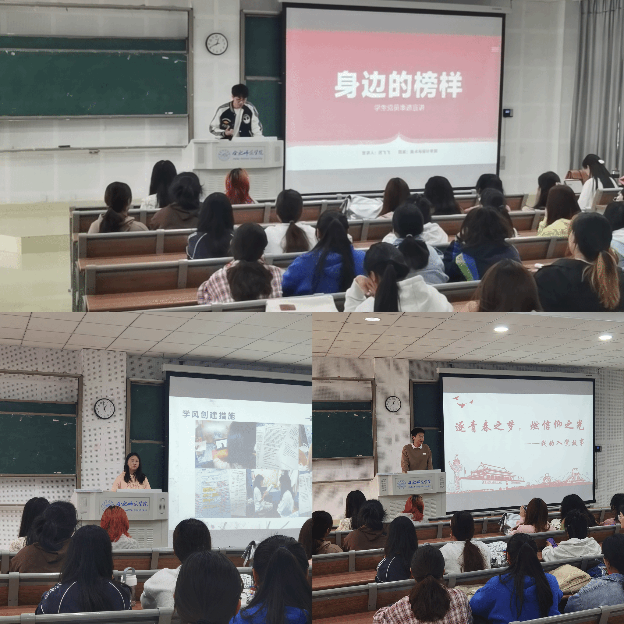 员工党支部三名优秀员工党员,通过党员典型事迹宣讲的方式,给学弟学妹们分享自己的成长故事:20级产品设计专业迟飞飞、视传专业郭小琬以及21级服装专业戴志峰分别从自己入党前与入党后以合格党员标准时刻严格要求自己在各方面发挥先锋模范作用、所在宿舍全体同学一起创建宿舍优良学风积极向党组织靠拢以及逐青春之梦燃信仰之光参与公益活动志愿服务等典型事迹,让新生感受到榜样在身边。