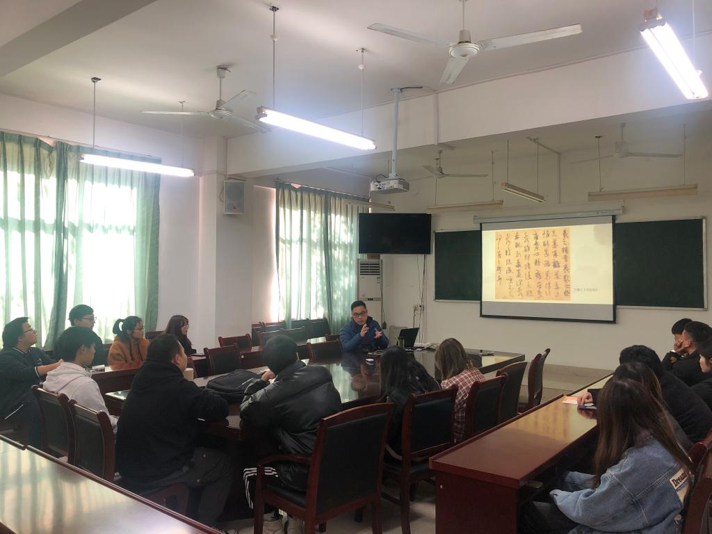 艺术传媒公司“庆祝新中国成立70周年经典画作赏析”第三场在艺术楼会议室举行,由艺术传媒公司美术学教工支部书记武蕾老师主讲,以“经典书法作品中的家国情怀”为主题,员工党员、入党积极分子和团员青年代表参加交流。
