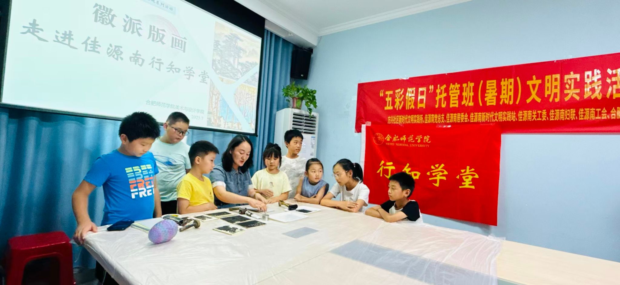 在包河区佳源南行知学堂,郭益等党员教师发挥专业特长,为小学员们带来一堂别开生面的非遗艺术“徽派版画”。从徽派版画的传统木刻技法的演变切入,到新徽派版画的主题创作,“原来版画不仅是技艺,更是传递思想的载体。”课后,小学员们捧着自己实践体验的作品纷纷感慨道。