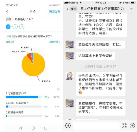 为切实全面了解毕业班同学疫情期间在家做毕业设计(论文)的情况,公司设计并开展了毕业论文(设计)专项调查,如美术学系马晴老师组织开展了网上问卷调研。多渠道积极了解同学们设计与论文的进展情况,了解同学们居家完成毕业生论文(设计)过程中遇到的困难。今年又第一次使用论文(设计)管理系统,理论实践教研室徐青老师前期学习了大量技术工作,指导和帮助公司员工老师解决技术问题能够顺利开展网上论文工作开展。公司领导们也针对员工反馈的问题,在每周教学例会中讨论并制定了周详可行的实施方案,共克时艰推进论文工作有序开展。(艺术传媒公司:徐青)