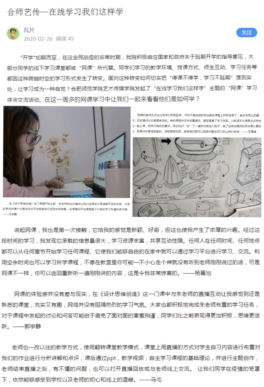 共享了一种收获。重视共同学习实现共同进步,发挥在线学习制度转化为学习力量,重点突出了“分享、传递、转化”的线上学习方式,即为突出分享学习实践,传递学习经验,转化学习行为,并结合公司办好“合师艺传—在线教学我们这样教”和“合师艺传—在线学习我们这样学”电子专栏,协同专业课老师和公司实践教研室,协同教师党支部党员,编辑“合师艺传—在线学习我们这样学”电子专栏文稿,通过线上班会、班级QQ群、公司官网、公司微信公众号等途径,进行广泛宣传,加强交流学习经验实践,形成优势互补,达到资源共享,相互学习、相互交流、相互促进、共同提高的目的。