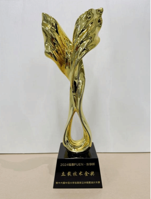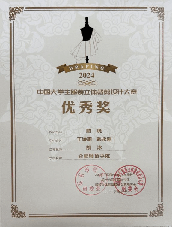 大赛前期共有45所专业院校330组选手报名,经过评选40组作品参与决赛及动态展演。由胡冰老师指导2021级服装与服饰设计专业王诗颖和韩永刚同学共同完成的作品《顺境》受邀参加决赛及动态展演。王诗颖同学以扎实过硬的专业能力在决赛的现场技术评定中脱颖而出,斩获该组别唯一金奖,取得了历史突破。同时,设计作品《顺境》在动态展演中荣获优秀奖。