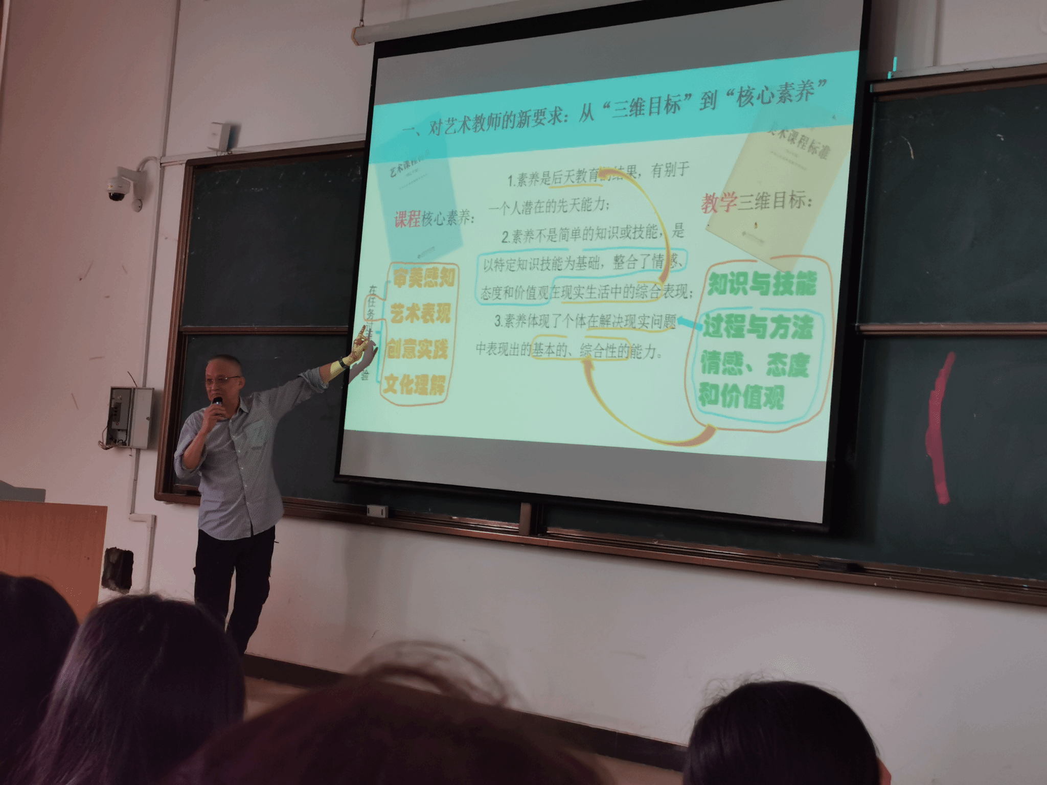 孔新苗教授以“美育”为切入点,向在场师生介绍了新时代美育的新思路与新趋势。归纳了以美育为中心开展艺术教育的三大前沿问题:一是“公司美育”对艺术教师的新要求,二是关于“课程综合”,三是美育的艺术教育是一代人的新课题。孔新苗教授对比了新时代下美术教师与美育教师的区别,引导同学们进行对比理解,并在比较视野中分析从“三维目标”到“核心素养”的变化,并强调“解决新时代美育问题的途径是引导员工在任务驱动的情境中学习。”