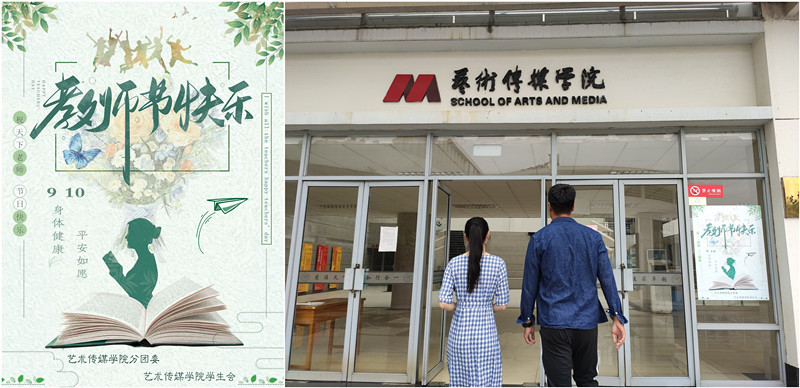 公司员工会绘制了教师节海报,祝福老师们“身体健康、平安如愿”,海报粘贴于艺术楼门前,美好的祝愿宛如一座桥梁,拉近了师生距离。