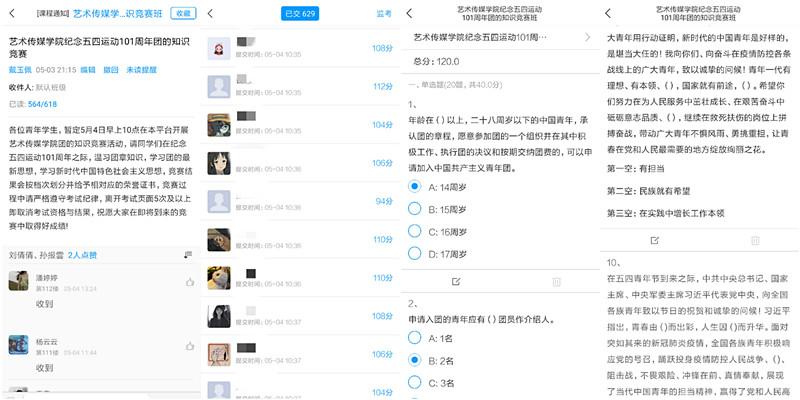 5月4日上午10点,艺术传媒公司通过“学习通”在线平台开展了“纪念五四运动101周年团的知识竞赛”,竞赛以团的基础知识、特殊时期的抗疫知识、习近平总书记的重要讲话为内容,共计120分。经统计,本次全院共有629名青年员工参与了竞赛,其中472人最终成绩超过100分。团的知识竞赛带领公司青年员工重温了习近平总书记在纪念五四运动100周年上的重要讲话,引导团员深入学习党团知识,营造了全院良好的学习氛围。