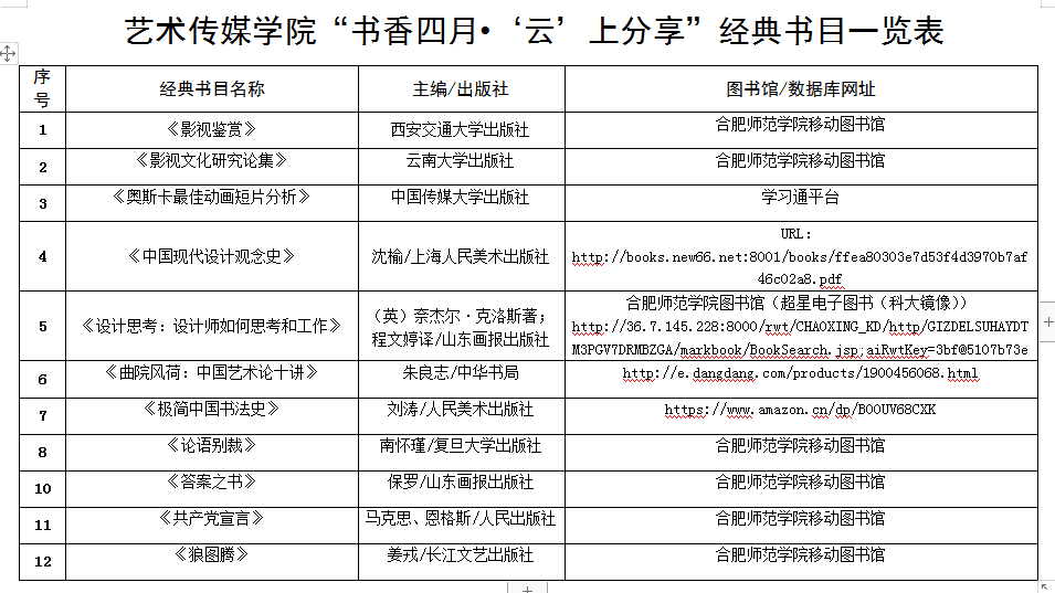 雅言传承文明,经典浸润人生。本次活动以“读好书、读经典”为主要内容,以“四结合”展开:一是活动形式以读书活动与主题党日相结合,二是推荐书目以教师推荐与员工自选书目阅读相结合,三是思政教育与专业精神教育提升相结合,四是线上阅读与“云”分享读书心得相结合。目前,专任教师和辅导员已为员工提供经典书目37本,后期再推由中宣部指导、中国图书评论学会评选的“2019年度中国好书”,共邀员工畅游线上书海,活动将持续至5月下旬,届时公司将对员工读书心得(读书随笔、读书故事)进行院级评选。(艺术传媒公司:李舒、朱宇迪)