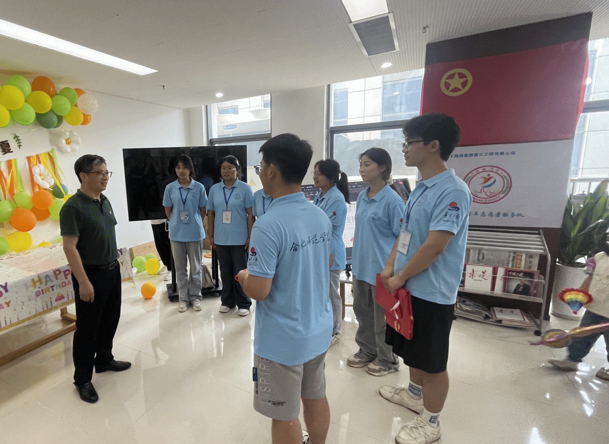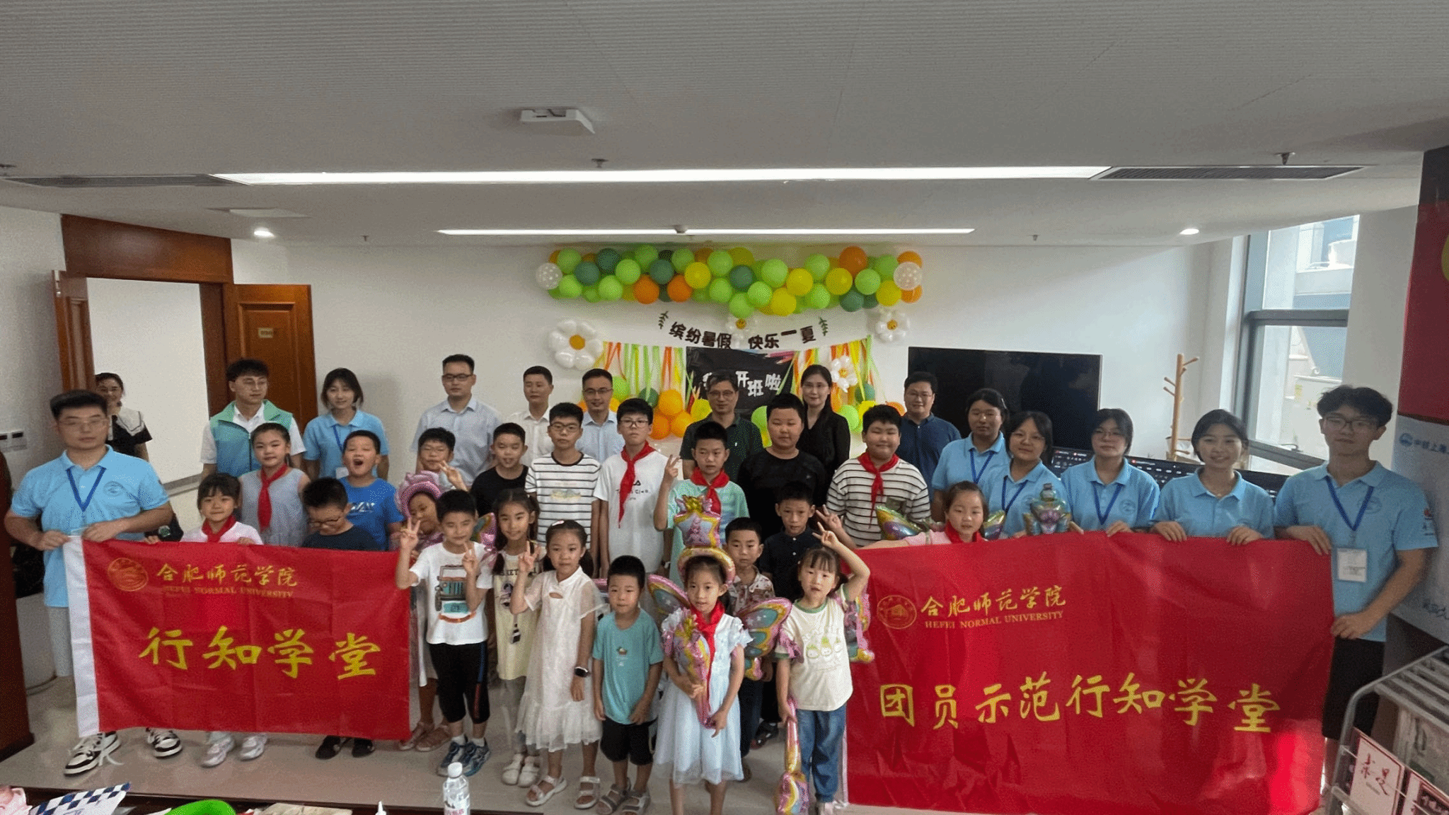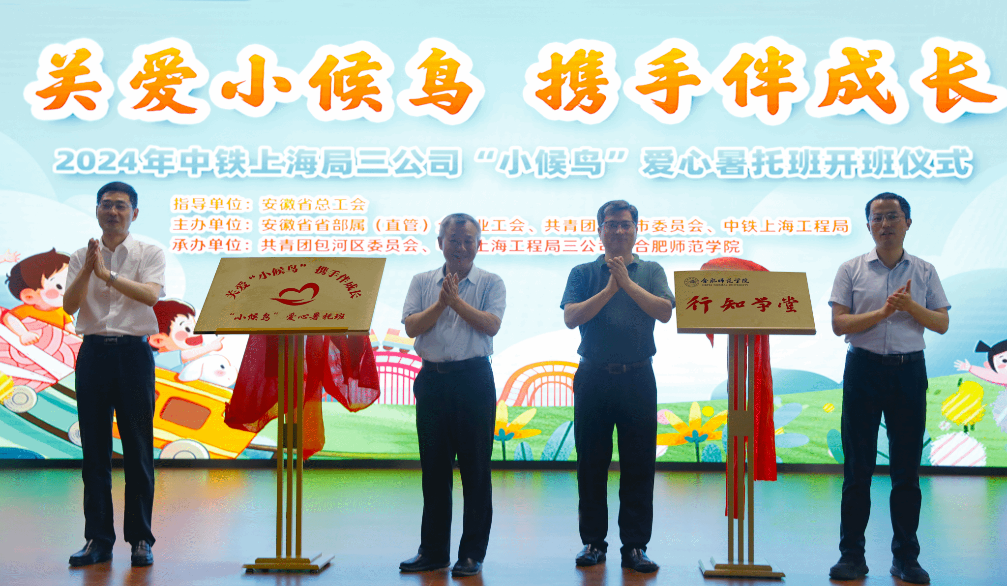 7月19日下午,党委委员、副经理华银峰在校团委、太阳成集团122ccvip负责人陪同下,来到中铁上海局三公司看望太阳成集团122ccvip“小候鸟”行知学堂的小先生和小学员们,实地指导行知学堂暑期社会实践活动,并参加“小候鸟”行知学堂及企业爱心暑托班的开班仪式。省总工会、团省委、合肥团市委、包河团区委、中铁上海局三公司相关负责同志一同参加开班仪式。