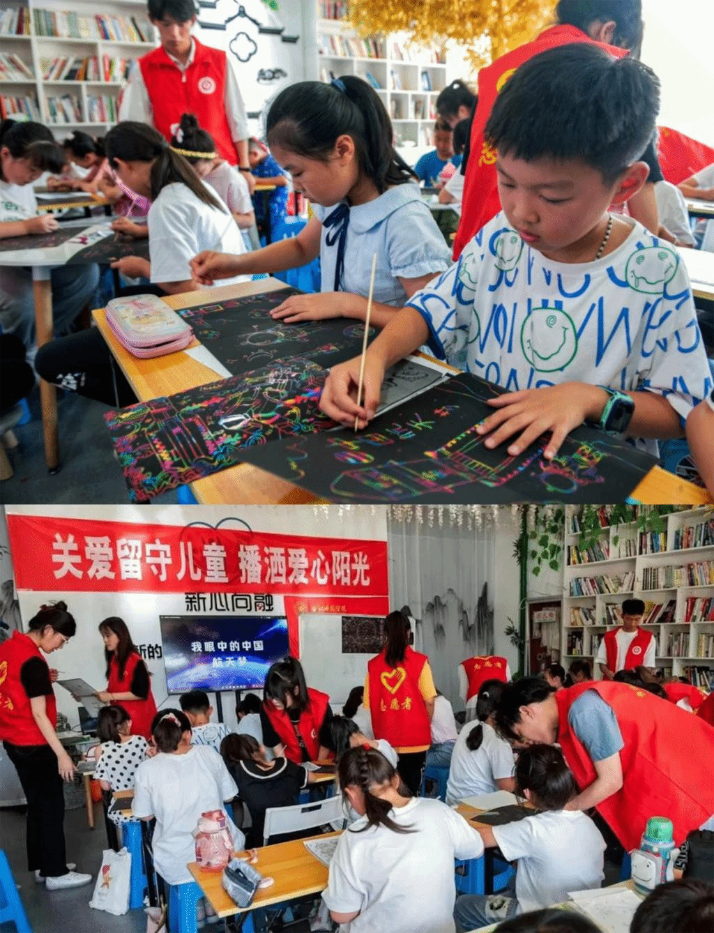 随着课程的推进,“小先生”刘宇通向同学们展示了太空美景,讲述了中国人数千年来渴望遨游太空的愿望,普及了中国航天的知识,讲述了新中国成立以来航天事业从无到有、由弱到强迅速发展的历史。课堂活动阶段,同学们用竹签在刮画纸上作画,认真的完成并展示自己的“航天梦”主题绘画作品。