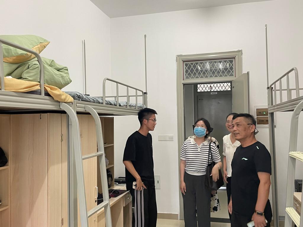 下午16时,大部分新生已到校,余洋和三位新生辅导员前往宿舍慰问员工,亲切地同新生进行交谈,询问员工的专业、来自哪里、是否带齐生活用品,并且强调了防疫安全、人身安全和财产安全问题。此外,余洋等还细心查看了员工宿舍的门窗是否损坏、新生购买卧具的清单以及浴室洗浴条件,要求辅导员一定要深入宿舍,与员工以情沟通、用心交流。