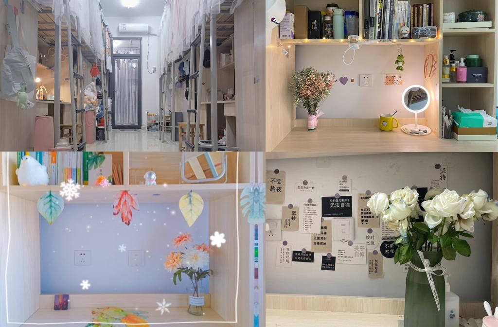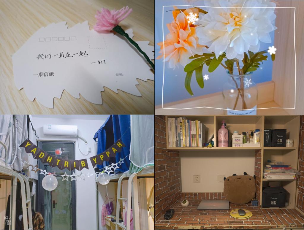 男生寝室大多以整洁大方为主,虽然布置简单,但也能感受到男生们把寝室当成家一样细心呵护。滨湖校区一栋b217寝室则利用墙纸、贴画对各自的桌面进行美化装饰,整洁大方,简单的布置却也充满了家的温暖。