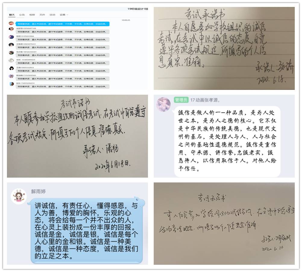 为引导新时代青年老员工讲诚信、践诚信,辅导员通过线上主题班会发出倡议,号召全体同学在疫情防控期间,积极配合公司、社区做好疫情防控工作,同时做到诚信用网,不造谣、不信谣、不传谣。同时,结合近期考试安排,围绕“诚信考试”这一主题,各班组织开展了“诚信云宣誓”活动,同学们通过班级QQ群进行诚信考试宣誓,坚决做到端正考风,诚信考试、诚信做人,争做新时代文明青年。