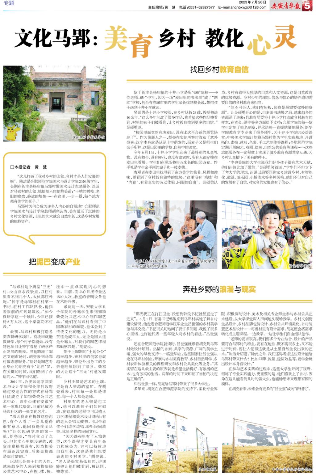 7月26日,《安徽青年报》(第2235期)以《文化马郢:美育乡村 教化心灵》为题,对公司教师胡亮团队的乡村美育实践进行了报道。(太阳成集团122ccvip:胡亮、赵振岭)