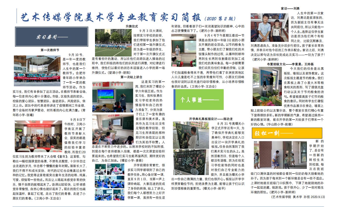 9月13日,艺术传媒公司官网继续推出美术学专业的第二期实习简报。其中,有七所公司的实习工作在简报中得到了展示(分别是合肥市青年路小学、合肥市卫岗小学、合肥市望湖小学、合肥市曙宏小学、合肥市曙光小学、合肥市淝河小学、合肥市华山路小学)。本期简报在第一期的基础上进行了重新排版(如上图),分实习要闻、个人事迹、轻松一刻三个板块,内容更加丰富,时效性更强。 “实习要闻”板块以实习生的“两个第一”,即 “第一个教师节”与“第一次站上讲台”为主题进行汇报展示;“个人事迹”板块以个人在实习公司的教学活动或参与校园文化活动建设为主题进行汇报展示;而“轻松一刻”板块是对美术学专业员工在实习中抓拍校园生活、师生及家长的精彩瞬间进行展示。